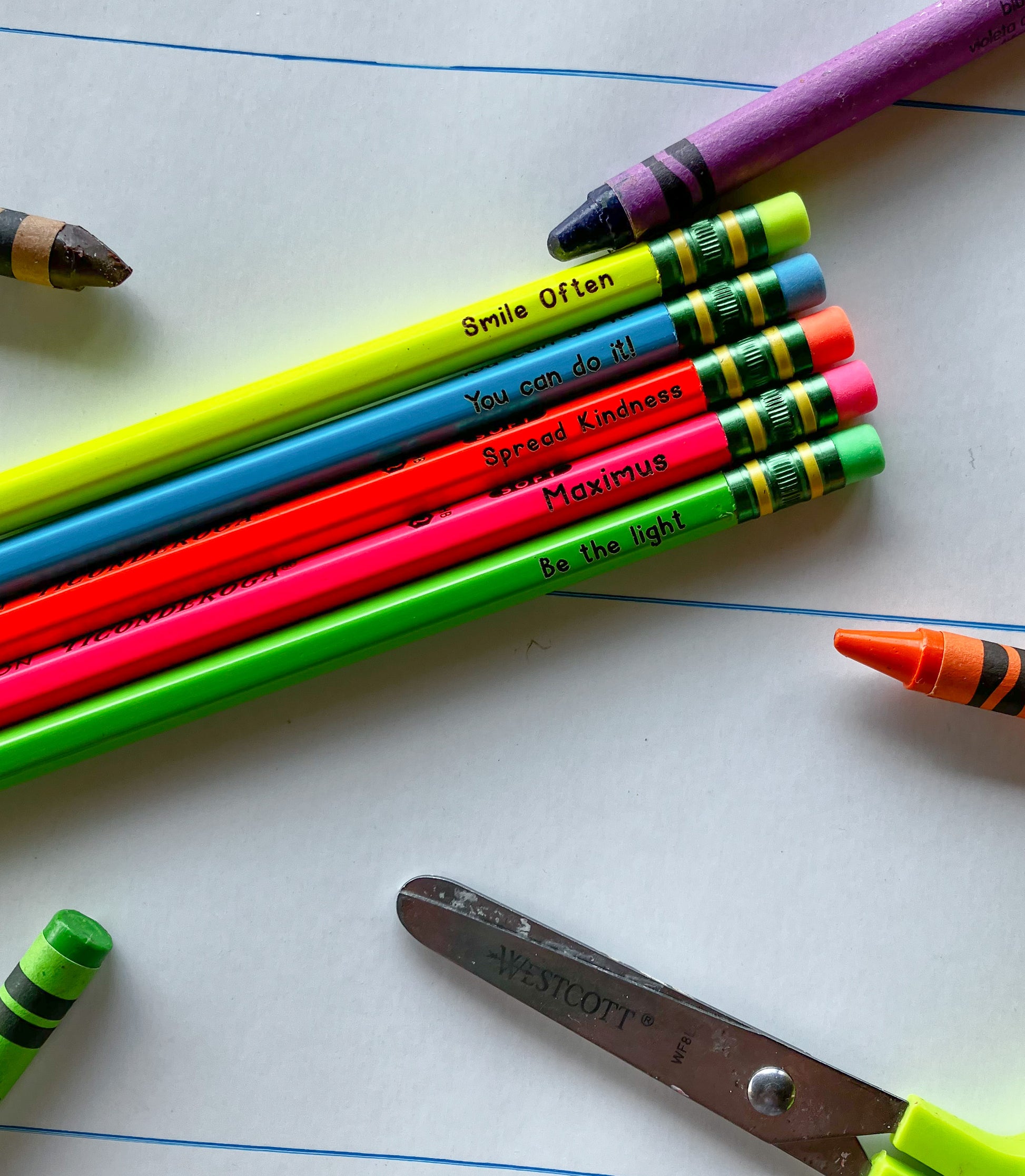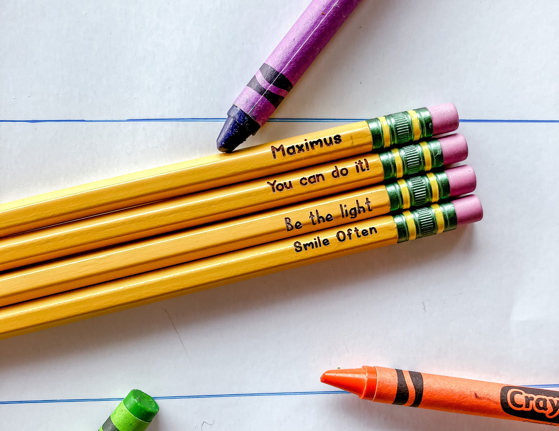Get your child ready for the school year with custom personalized pencils, perfect for keeping supplies organized and easy to identify. Each pencil is engraved with your child’s name or a short affirmation and makes a great back-to-school gift.